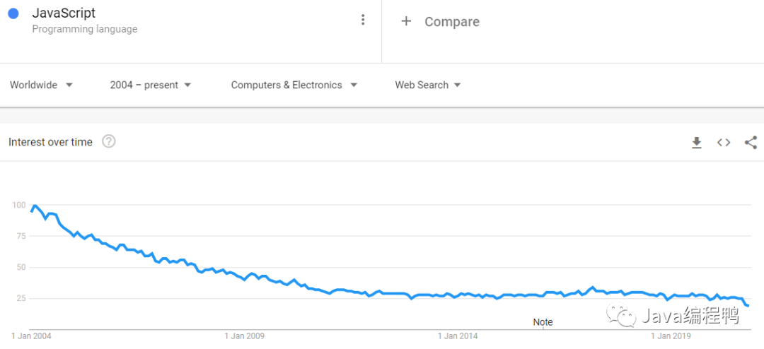 在网络开发的早期,Javascript的普及率达到了顶峰,此后在过去十年中一直保持稳定的趋势(图7)。