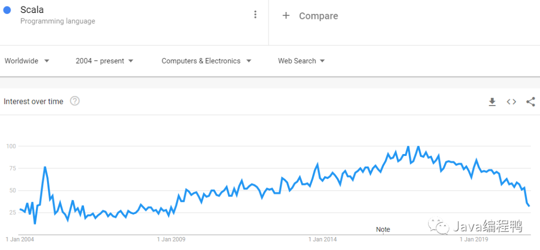 目前,Scala被认为是函数式编程的最佳编程语言之一(尽管它仍然提供对面向对象编程方法的支持)。就搜索受欢迎程度而言,Scala似乎在2018–2019年间在Google搜索上达到顶峰(图6)。