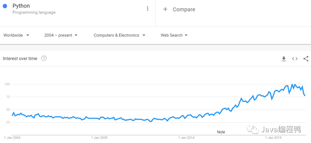 如今,Python是用于数据科学和机器学习任务的最受欢迎的编程语言。它是由Guido van Rossum于1991年首先开发的,此后它的受欢迎程度才刚刚提高(图5)。