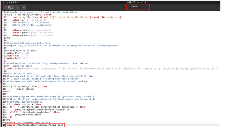 source devel/setup.bash**注:**若不想每次都设置环境变量,可将下面代码复制到.bashrc文件中,该文件为主目录下的隐藏文件(显示隐藏文件:ctrl+H)