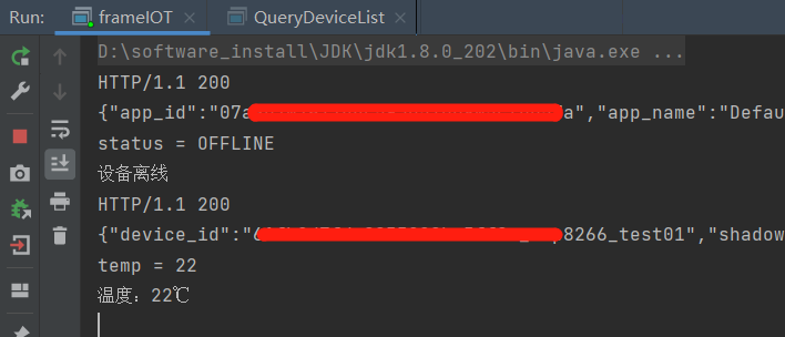 打开JavaApiDemo > src > main>java>com.huawei.demo.device > QueryDeviceList.java文件,将我们事先准备的相关参数填入后,右键运行“QueryDeviceList.main()”