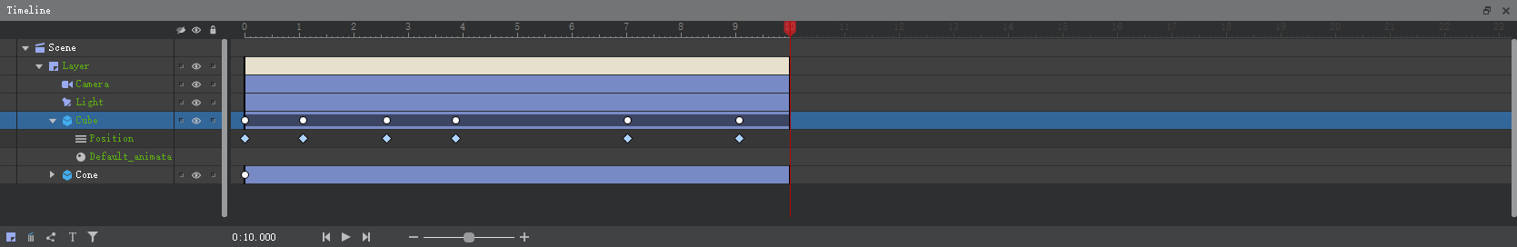 时间线这个东西我第一次接触是在AE和AU中,那么,在Qt 3D Studio中,任何神奇的动画组合都是在这里实现的,当然,我们后期是可以通过代码来控制和修改的。
