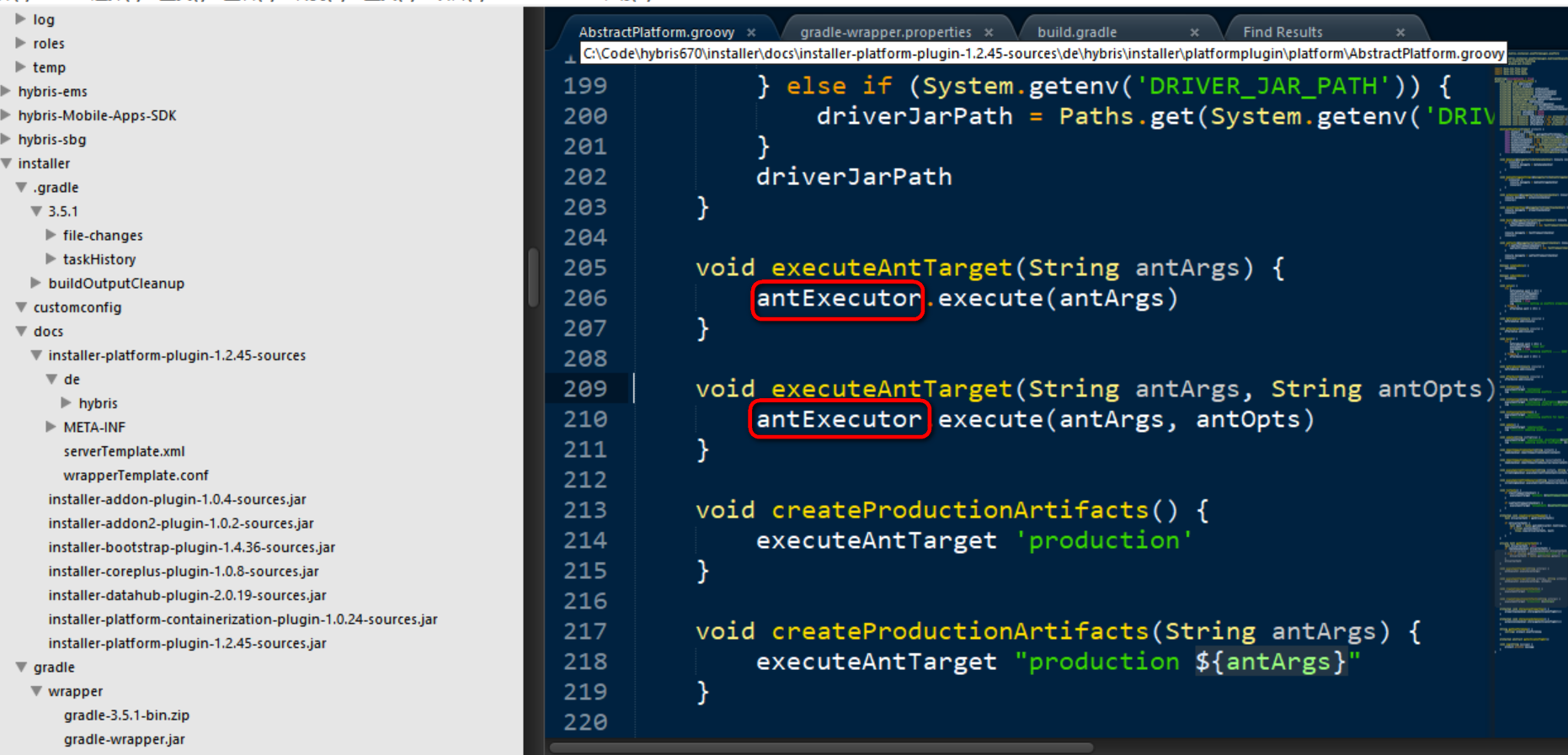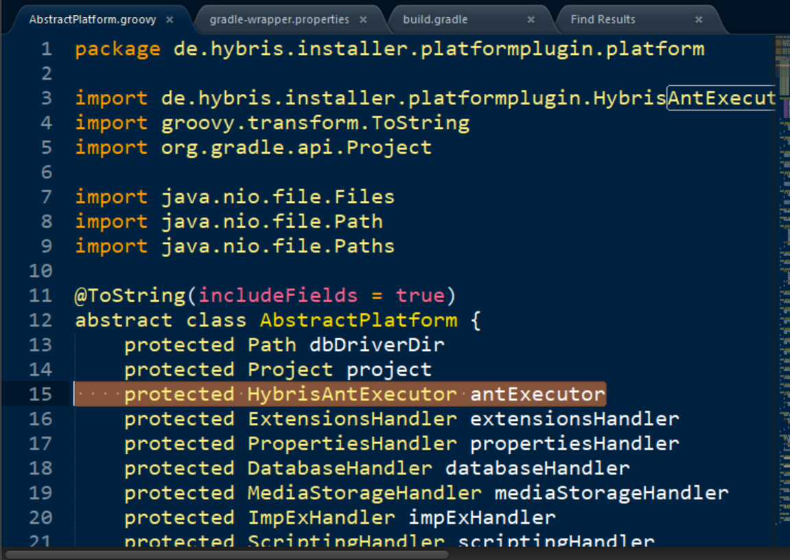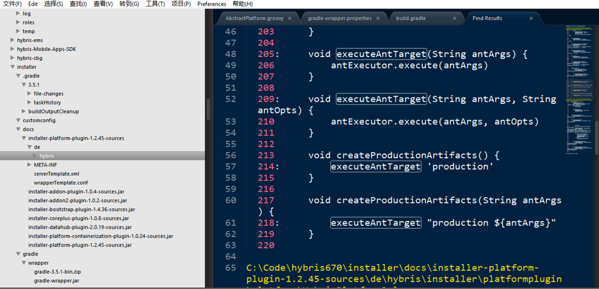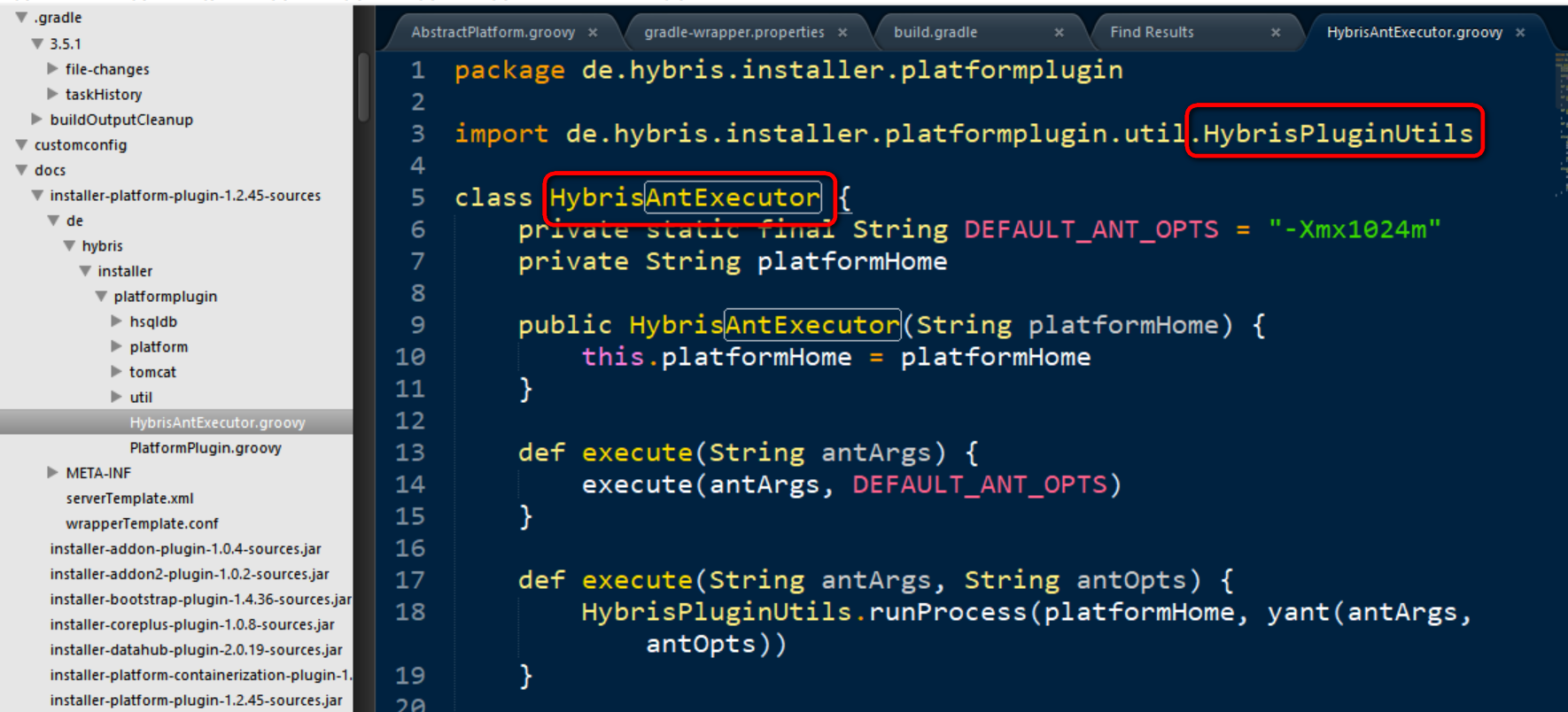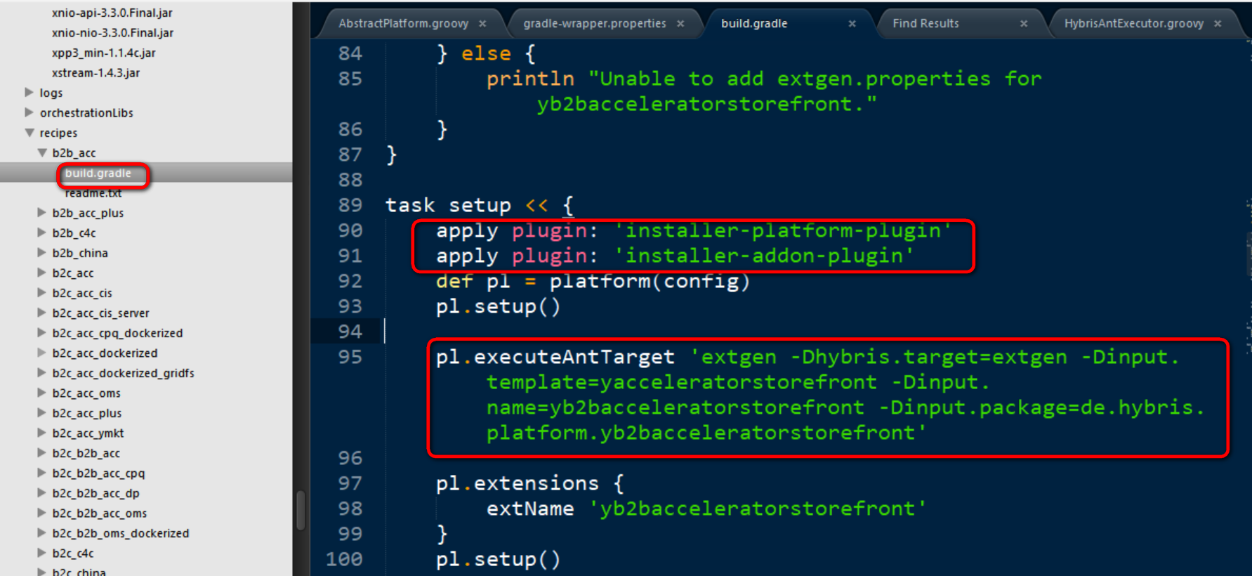 打开Hybris安装文件夹下的recipes,随便打开一个recipe的build.gradle文件,发现使用了installer-platform-plugin和installer-addon-plugin这两个plugin. Groovy setup任务的逻辑,也就是使用这两个plugin里的实现,根据config实例化platform对象,然后调用其setup方法和executeAntTarget方法。