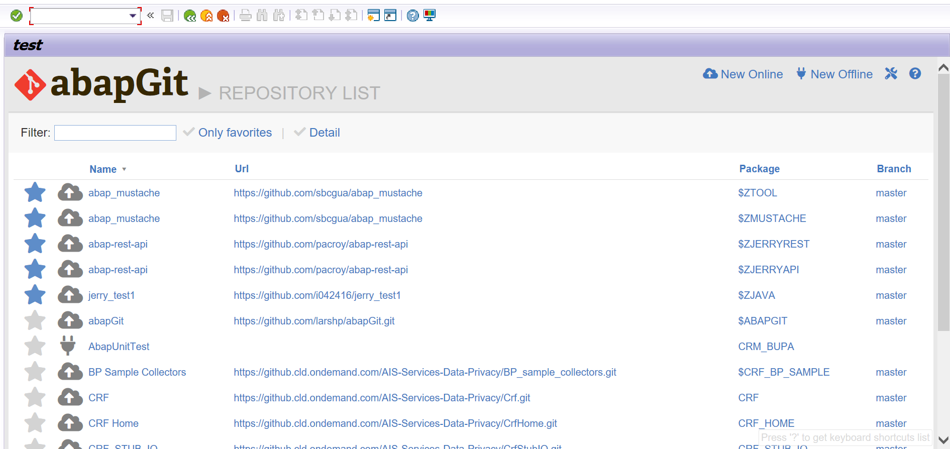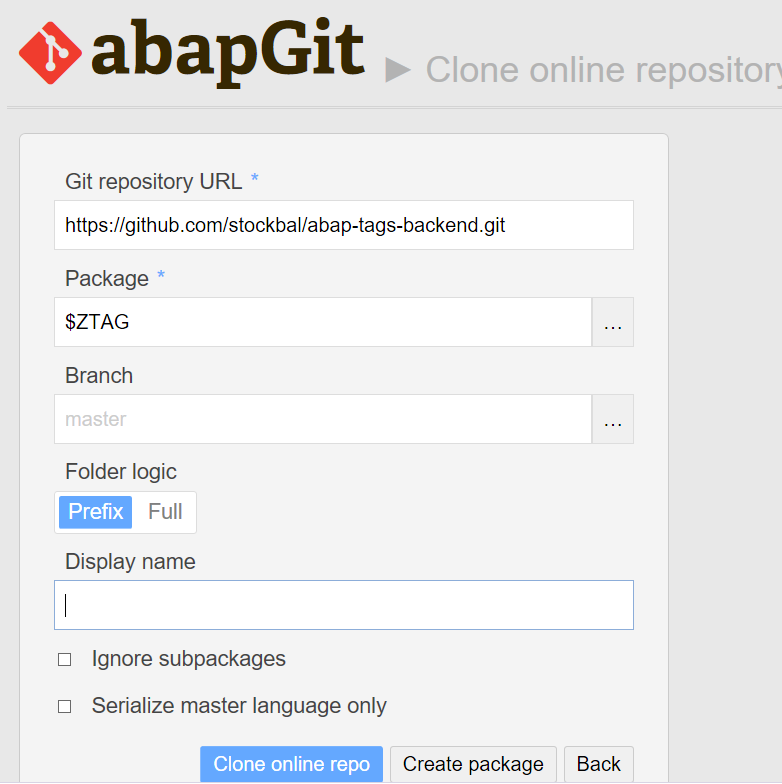 将ADT标签管理的后台实现使用abapGit pull到当前的ABAP系统,点击Clone online repo: