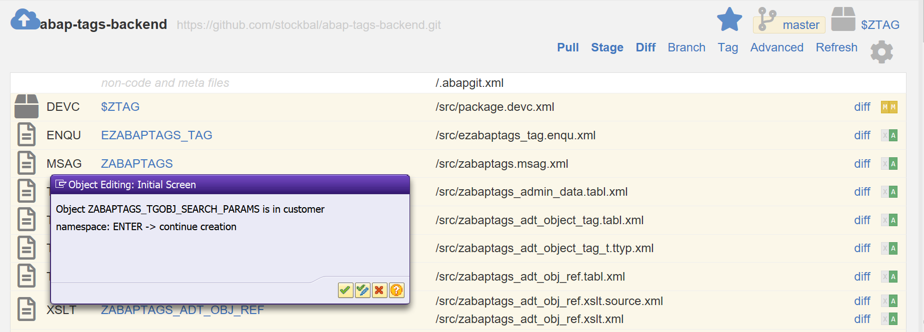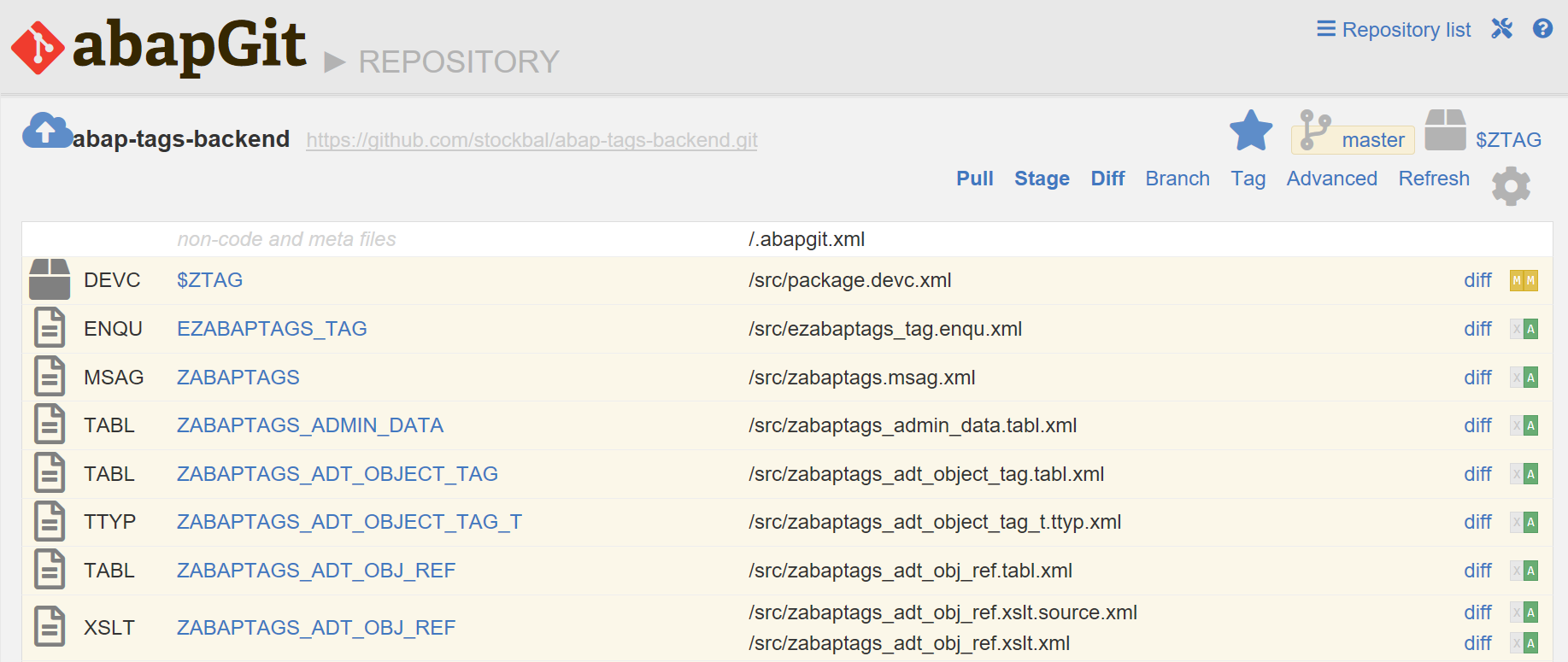 然后在当前的abapGit客户端内,已经可以看到abap-tags-backend这个Github仓库了: