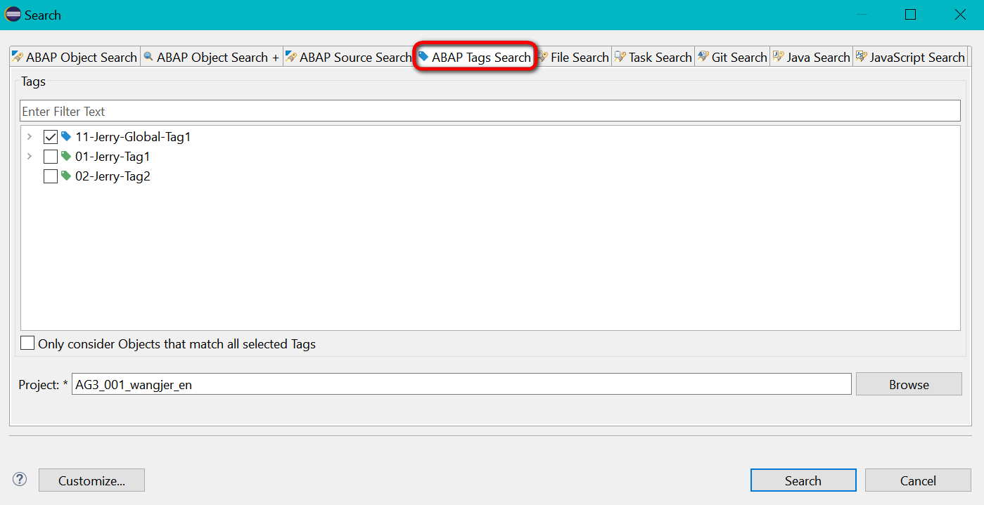 在快捷键为Ctrl+H的全局搜索页面里,增添了一项根据标签搜索ABAP对象的选项: