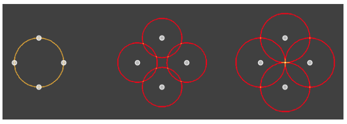 要了解 CHT 的工作原理,请考虑下图,其中输入圆(左)中的 4 个像素被描绘为半径为0.6*r(中心)和半径为1.0*r(右)的圆。