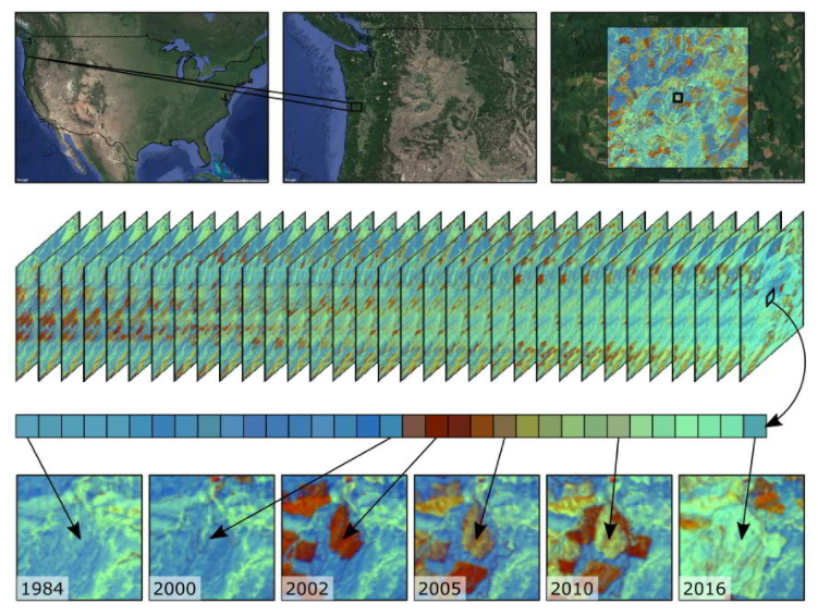 图 2.1。每个像素都讲述一个故事。Landsat 提供了景观特征的历史记录。通过从 Landsat 影像的时间序列中提取单个像素,可以重新计算构成像素 1 公顷区域的特征随时间的状态和变化。在此示例中,我们分析了太平洋西北部(美国)工业林区的针叶林像素的历史,该区域经历了一段相对稳定的时期,植被急剧迅速丧失,随后又发生了再生。