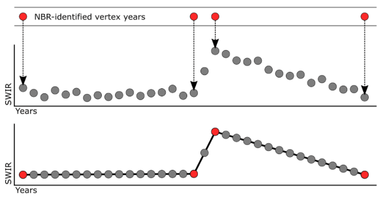 由于断点或顶点是按年份定义的,我们还可以将在一个光谱带或索引中识别的断点强加于任何其他光谱带或索引。例如,我们可以将像素时间序列分割为归一化燃烧比 (NBR: [NIR-SWIR]/[NIR+SWIR]) 以识别顶点,然后根据 NBR 分割短波红外 (SWIR) 波段-已识别的顶点(图 2.4)。