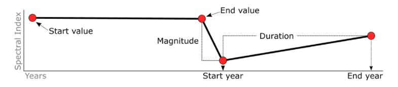 在实践中,LandTrendr 从像素的光谱历史中获取单一观点,如波段或指数,并通过一个过程来识别分隔光谱轨迹中持久变化或稳定时期的断点,并记录发生变化的年份发生了。这些由年份和光谱索引值定义的断点使我们能够将像素的光谱历史表示为一系列边界线段的顶点(图 2.2)。
