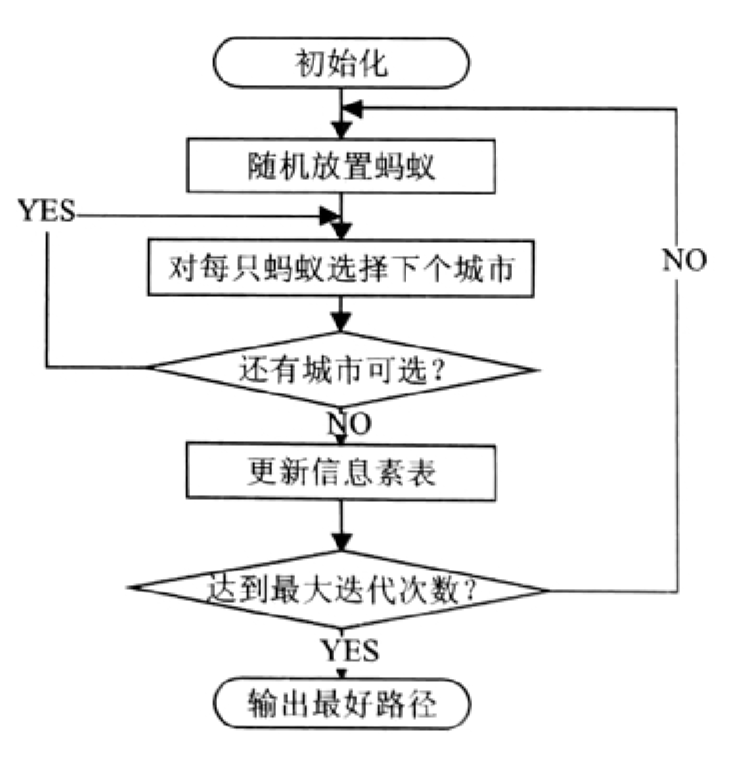 用蚁群算法求解TSP问题的算法流程如下图所示,具体每步的含义如下: