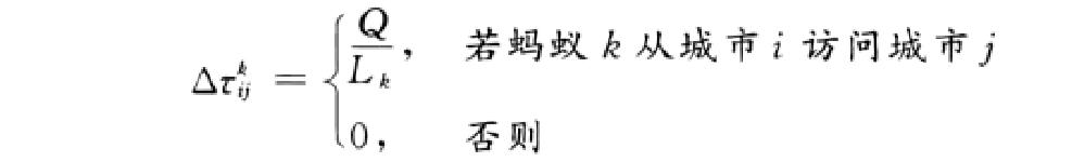 其中,Q为信息素常数,表示蚂蚁循环一次所释放的信息素总量; L k L_{k} Lk为第k只蚂蚁经过路径的总长度。