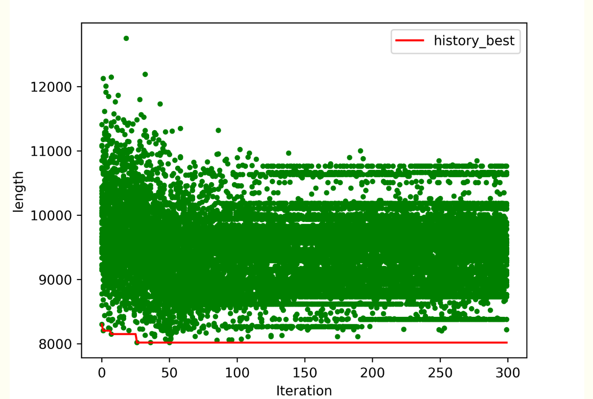 self.ants_info = np.zeros((self.maxIter, self.ants_num))  # 记录每次迭代后所有蚂蚁的路径长度信息