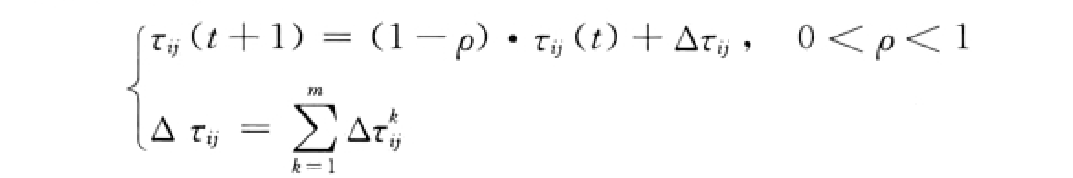 在蚂蚁遍历城市的过程中,与实际情况相似的是,在蚂蚁释放信息素的同时,各个城市间连接路径上的信息素的强度也在通过挥发等方式逐渐消失。为了描述这一特征,不妨令p(0<p<1)表示信息素的挥发程度。这样,当所有蚂蚁完整走完一遍所有城市之后,各个城市间连接路径上的信息浓度为: