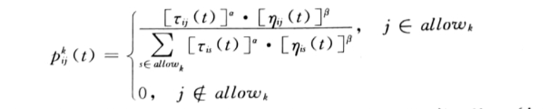 其中,$ \eta _{ij}^{t}$ 为启发函数,表示蚂蚁从城市i转移到城市j的期望程度: a l l o w k allow_{k} allowk(k=1, 2, …, m)为蚂蚁k待访问城市集合,开始时, a l l o w k allow_{k} allowk中有n一1个元素,即包括除了蚂蚁k出发城市的其他多有城市, 随着时间的推移, a l l o w k allow_{k} allowk中的元素越来越少,直至为空;a为信息素重要程度因子,简称信息度因子。其值越大,表示信息影响强度越大; β \beta β为启发函数重要程度因子,简称启发函数因子,其值越大,表明启发函数影响越大。