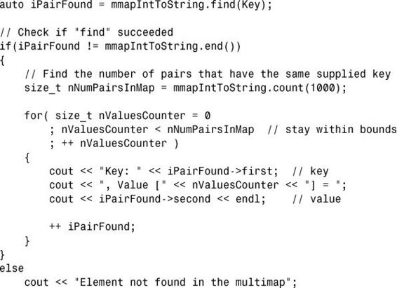 multimap容器可能包含多个键相同的键-值对,因此需要找到与指定键对应的所有值。为此,可使用multimap::count()确定有多少个值与指定的键对应,再对迭代器递增,以访问这些相邻的值: