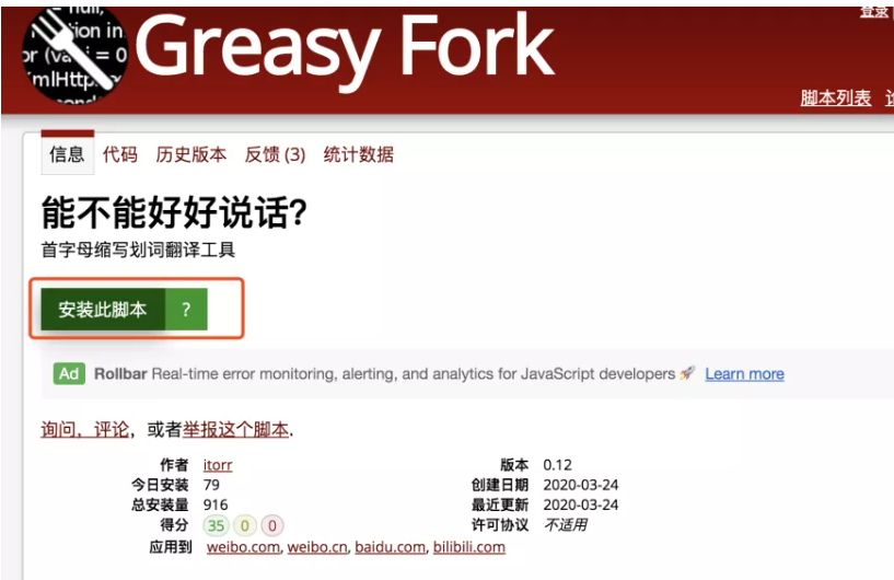 安装好用户脚本浏览器插件之后,在油猴网站上找到「能不能好好说话」脚本页面,直接点击安装。
