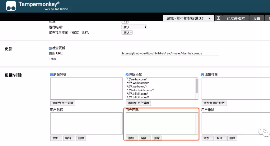 词条右上方出现的「+」,点击可以添加新的解释,审核通过后会录入。脚本版本目前能在微博、贴吧、B站页面下运行。如果你想在更多的网页上使用这个脚本,可以在相应的脚本管理器配置中设置用户匹配,添加对应 URL 规则即可。以Chrome浏览器的Tampermonkey为例: