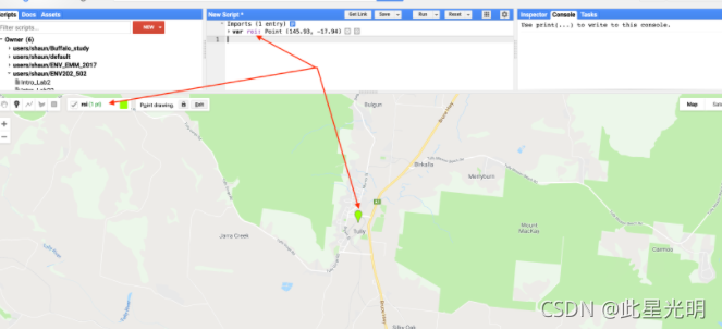 - 首先,我们需要使用以下脚本过滤 Sentinel-1 图像集合 (COPERNICUS/S1_GRD)。请务必使用几何工具在您感兴趣的区域上创建点几何(我们将以澳大利亚昆士兰北部的塔利地区为例)并将其重命名为“roi”。