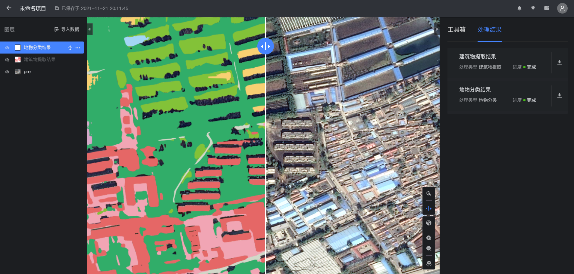 通过AI技术智能解译遥感影像,提取其中典型建筑物特征目标或区域,建议使用高分数据或无人机数据,数据分辨率在0.01m-2m之间。