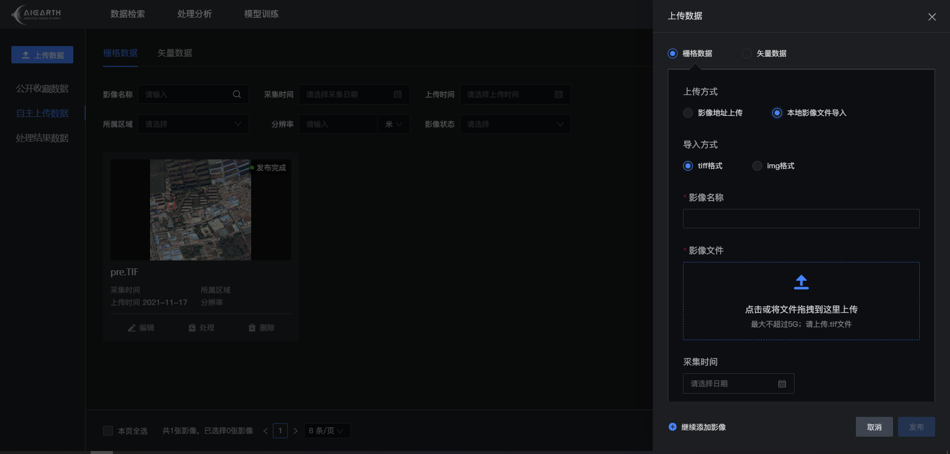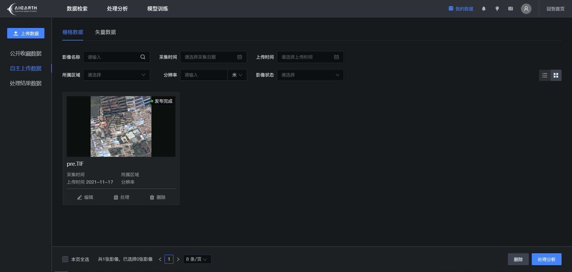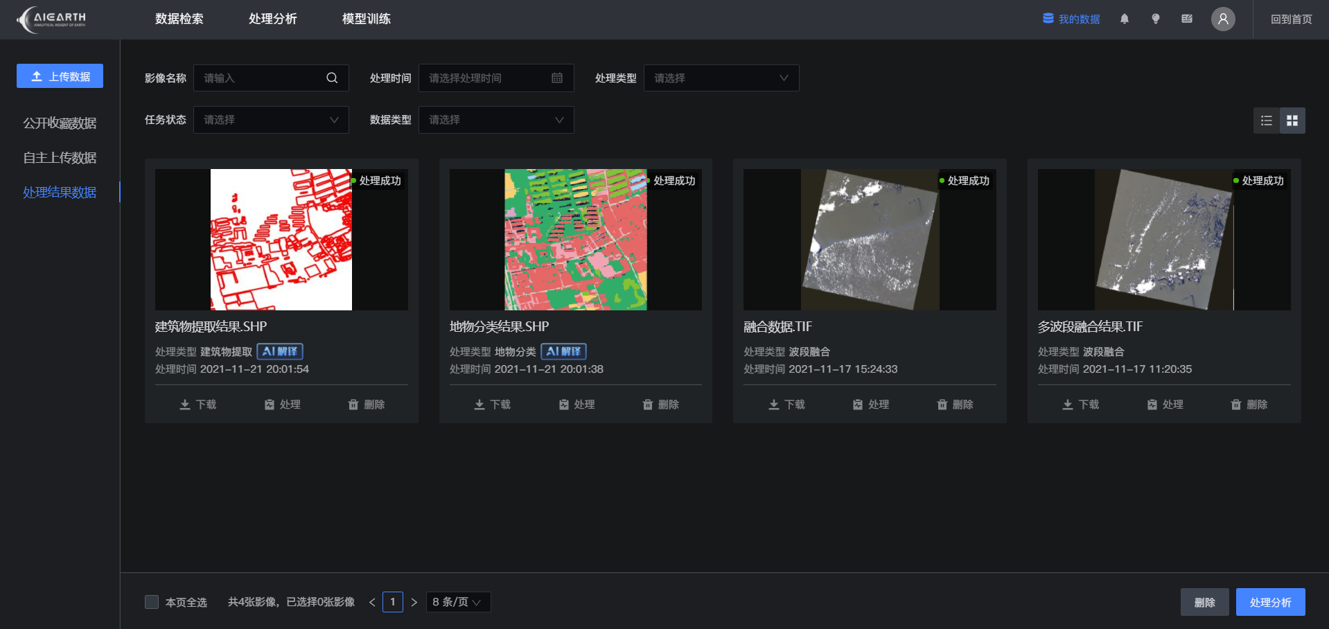 在我的数据页面,您可以查看在线检索后收藏的公开数据,或自主上传遥感数据进行后续分析,数据规格详见本文档第三节中相关要求,所有在线处理分析的结果数据也将汇总在此统一管理。