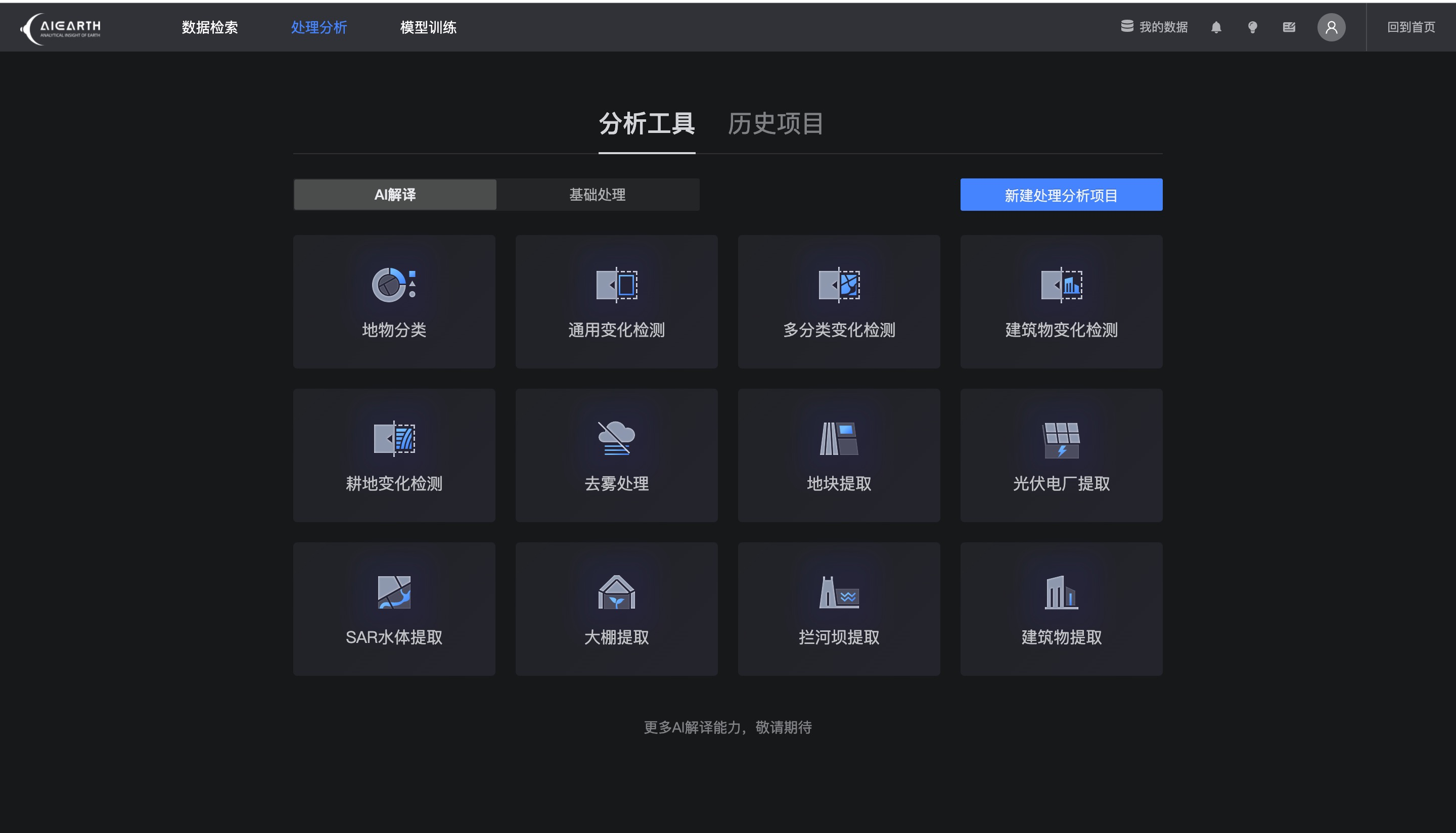 平台提供多种类型AI解译工具和基础处理工具,用于对公开收藏数据或自主上传数据进行在线分析处理。数据处理分析记录会以项目形式自动保存在历史项目列表。