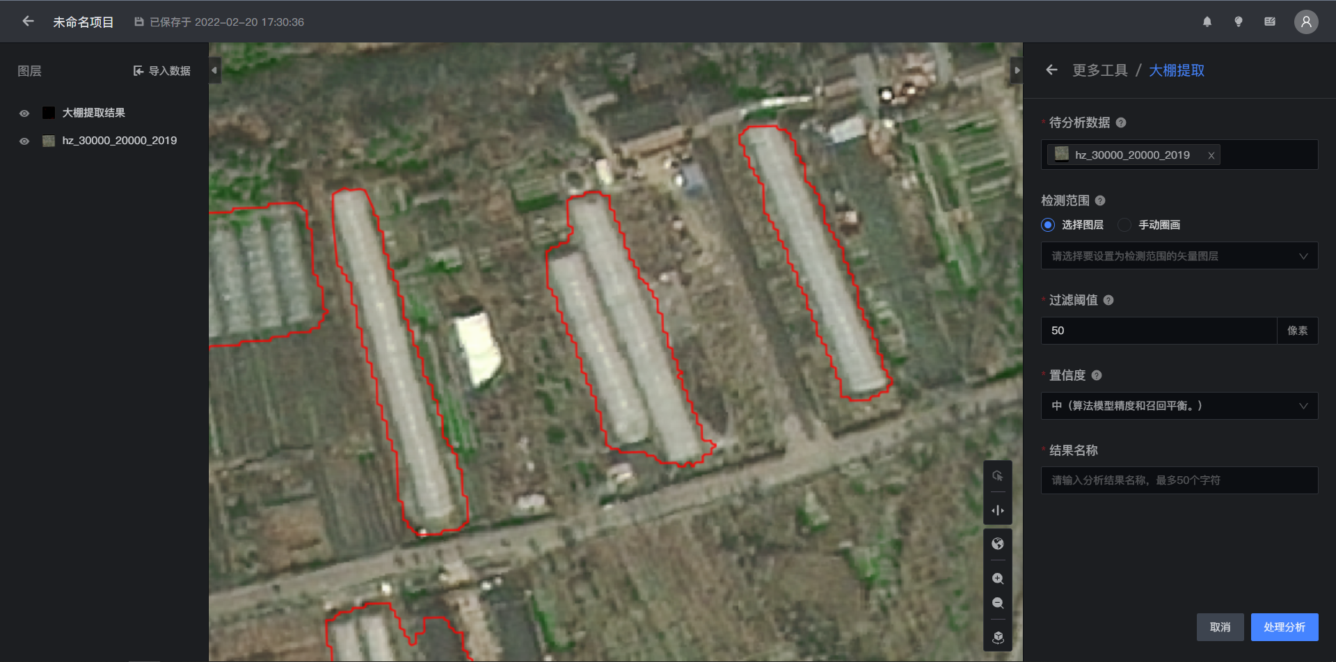 通过AI技术智能解译遥感影像,提取其中大棚区域,建议使用高分数据或无人机数据,数据分辨率在0.01m-2m之间。