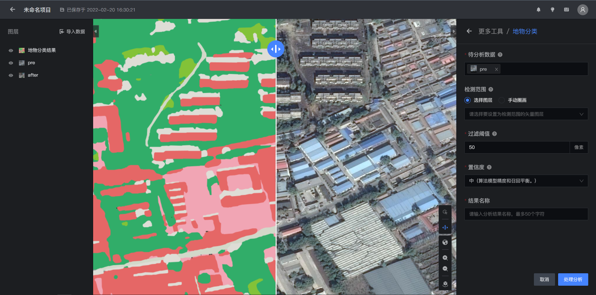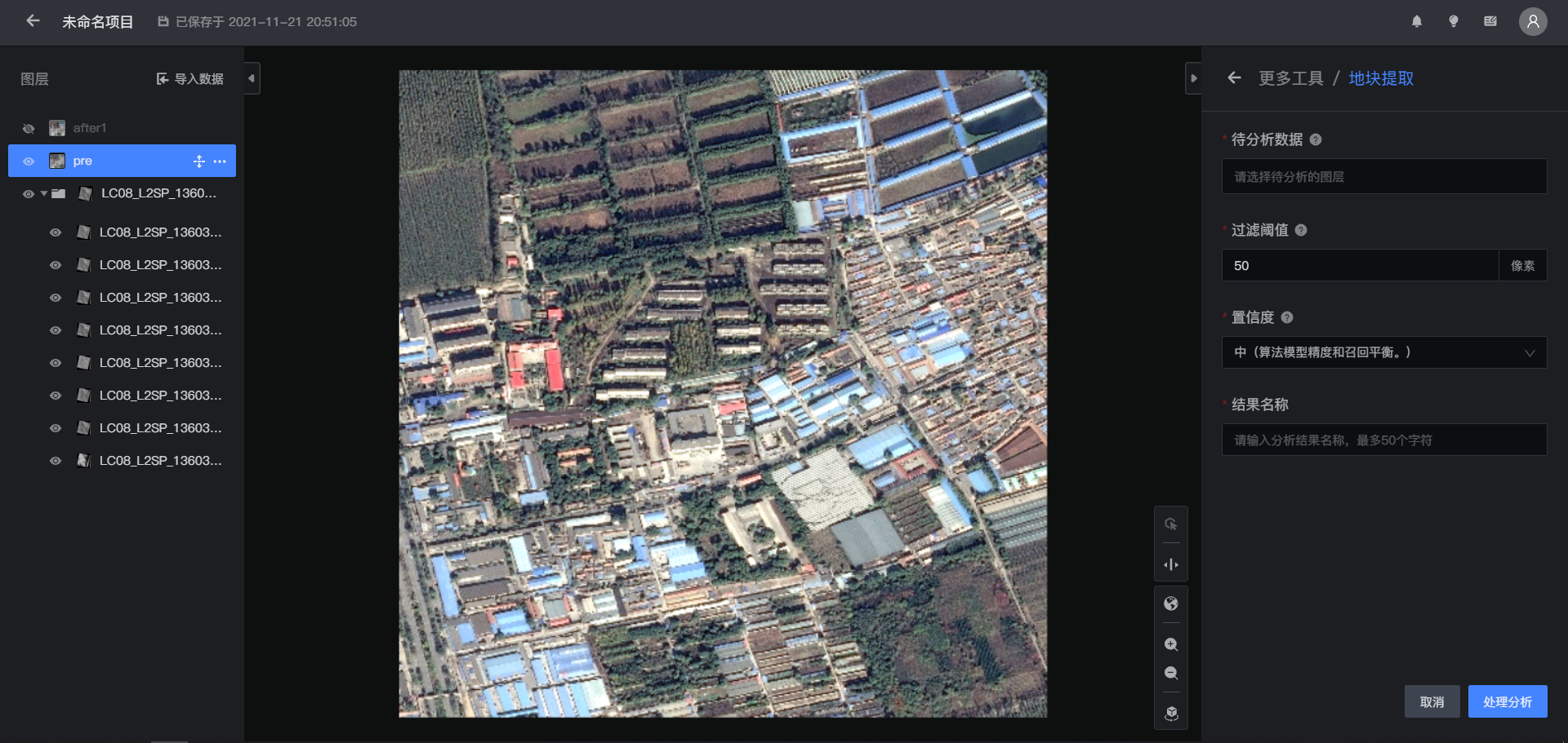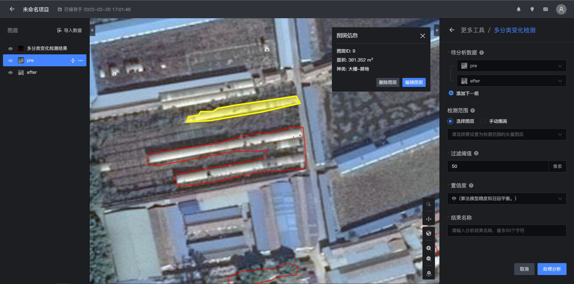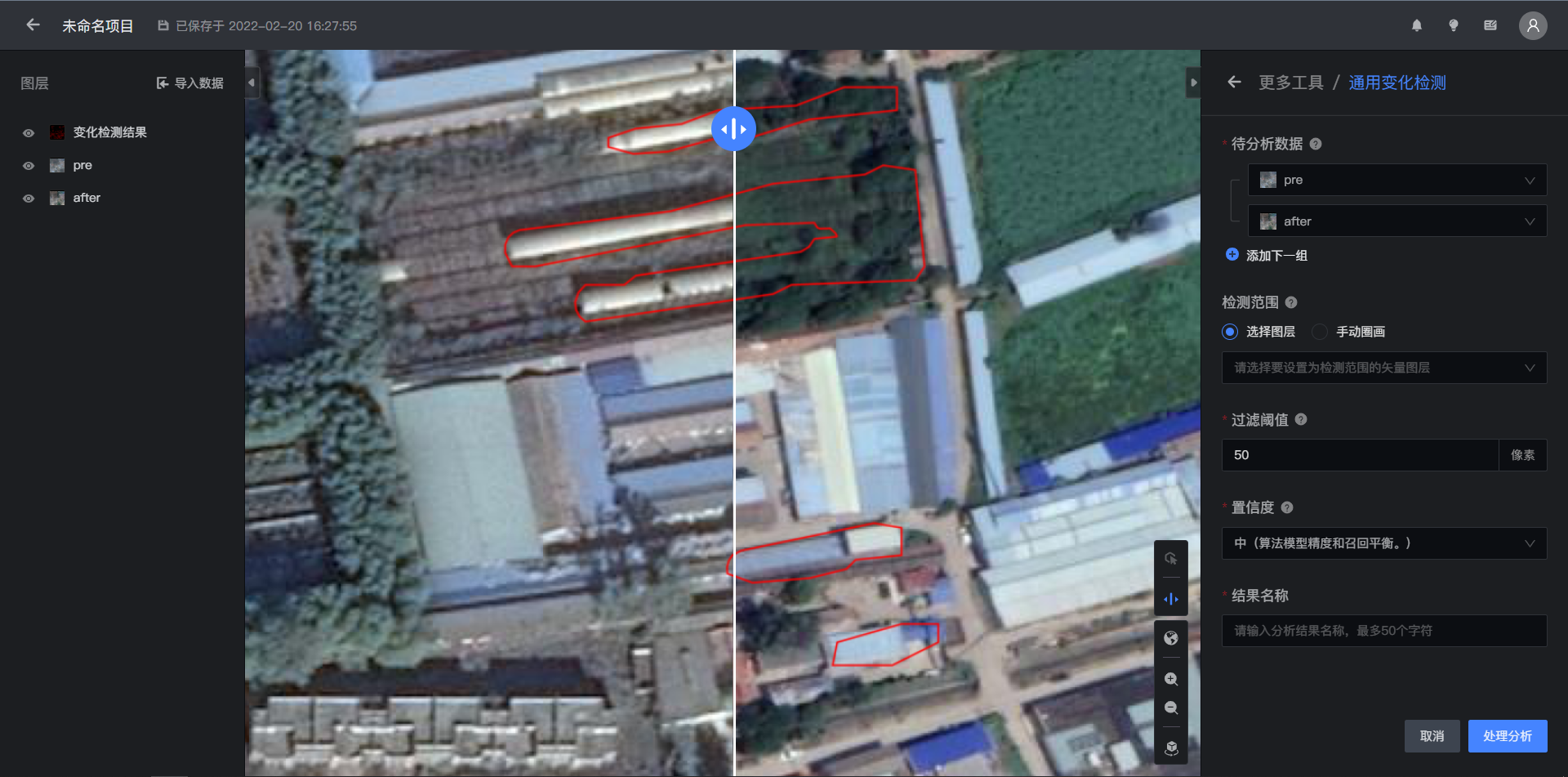 通过比对同一区域不同时期的两张影像,排除季节变化、阴影等干扰因素,提取建筑发生新建、改建、拆除的位置和范围,建议使用高分数据,支持0.01m-2m分辨率范围。