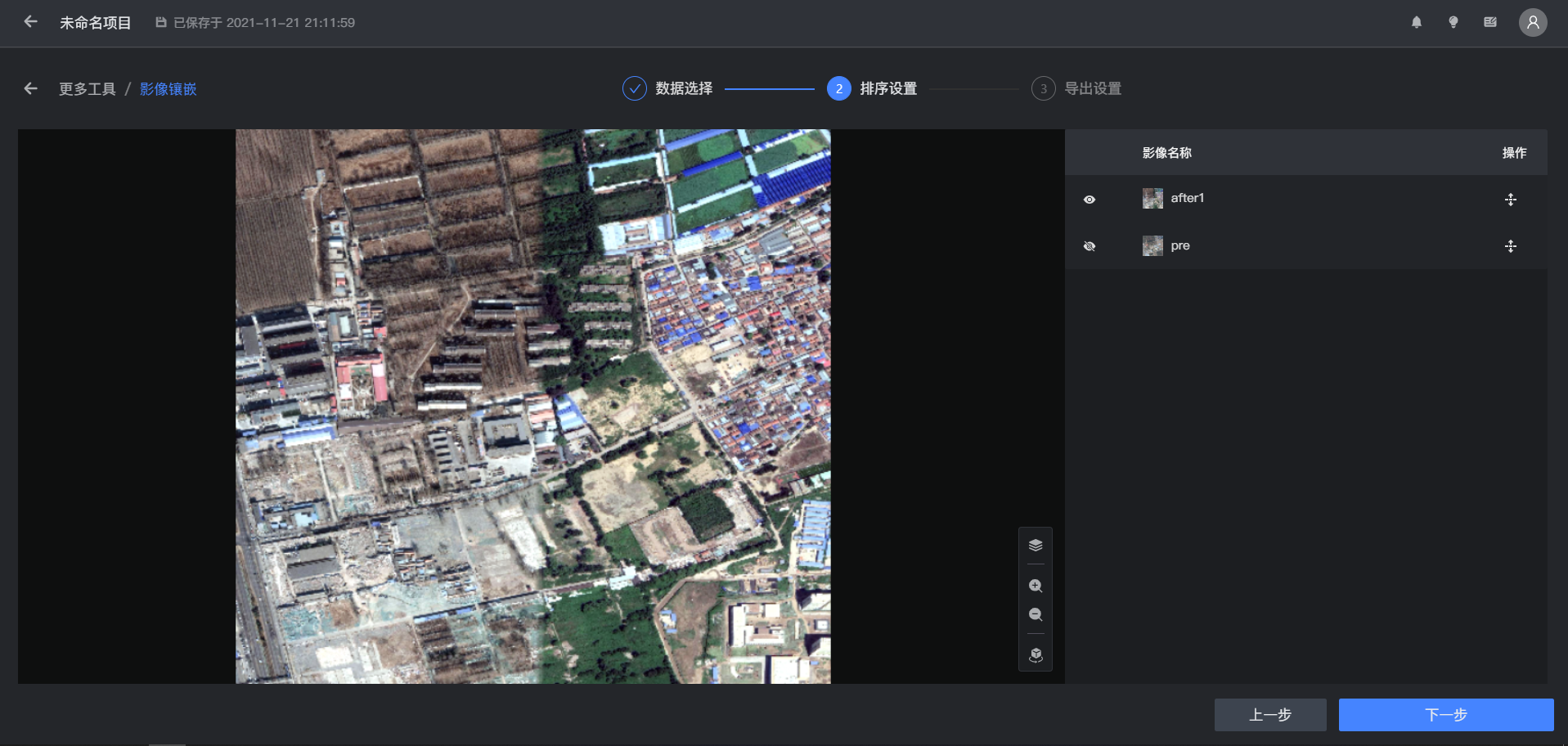 对栅格数据进行影像镶嵌拼接,选择图层间上下排序,镶嵌成果将另存为新的数据图层,同时保存至我的数据列表。