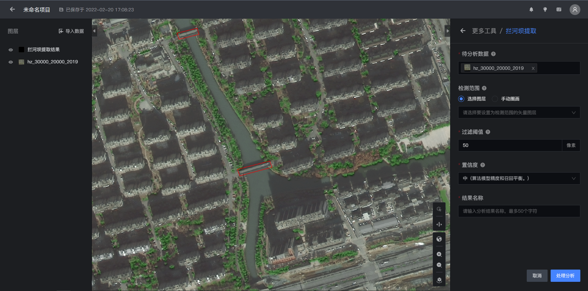 通过AI技术智能解译遥感影像,提取其中拦河坝区域,建议使用高分数据或无人机数据,数据分辨率在0.01m-2m之间。