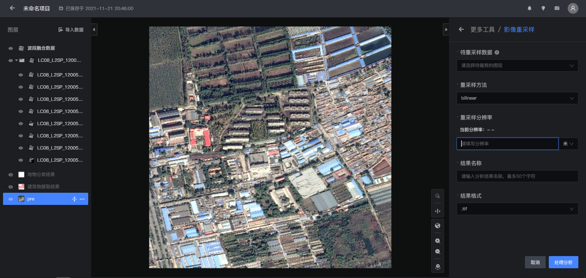 支持多种重采样方法对栅格数据进行分辨率重设,采样成果将另存为新的数据图层,同时保存至我的数据列表。