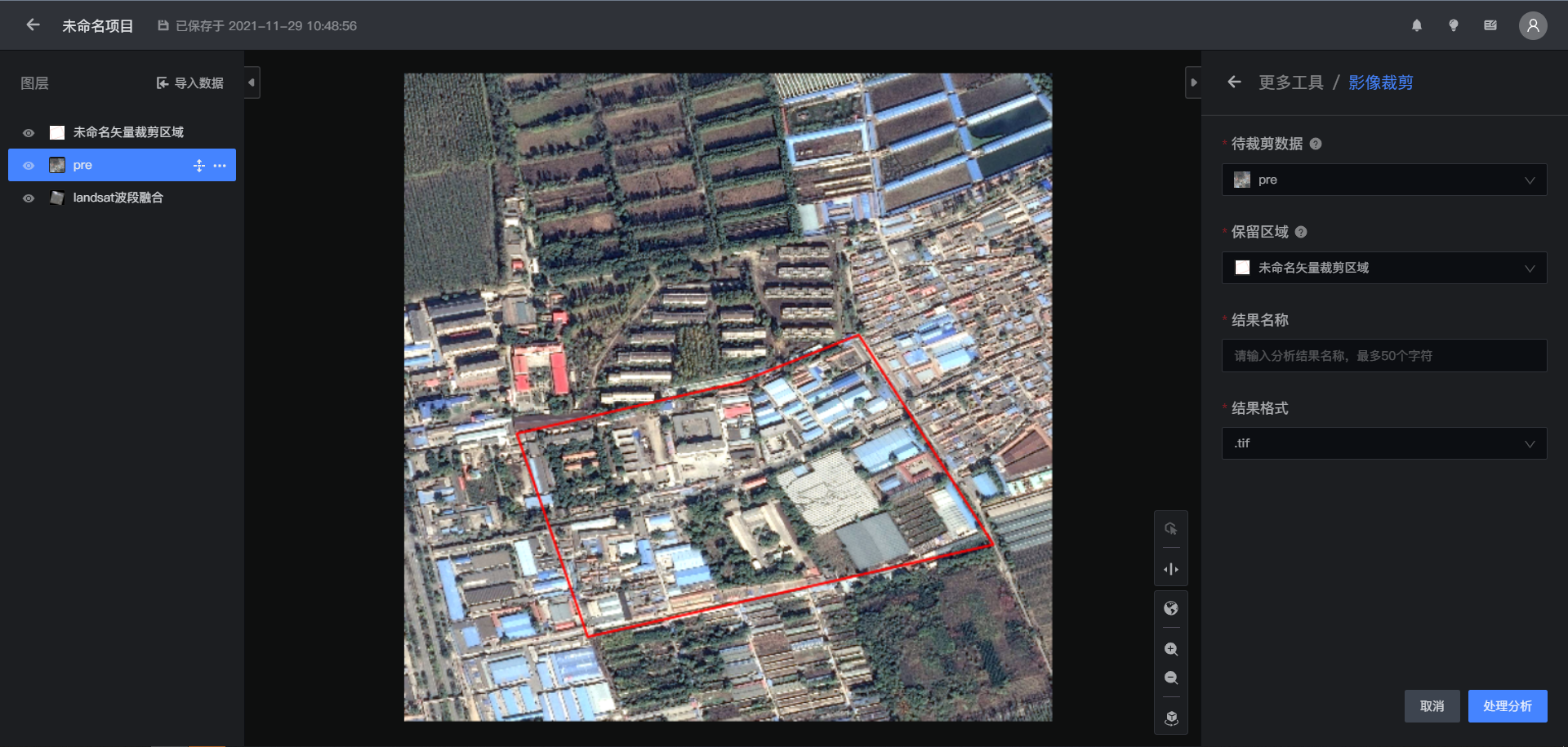 对栅格数据进行影像裁剪,可以使用矢量文件中的闭合区域进行裁剪或手动圈在线画区域进行裁剪,裁剪成果将另存为新的数据图层,同时保存至我的数据列表。
