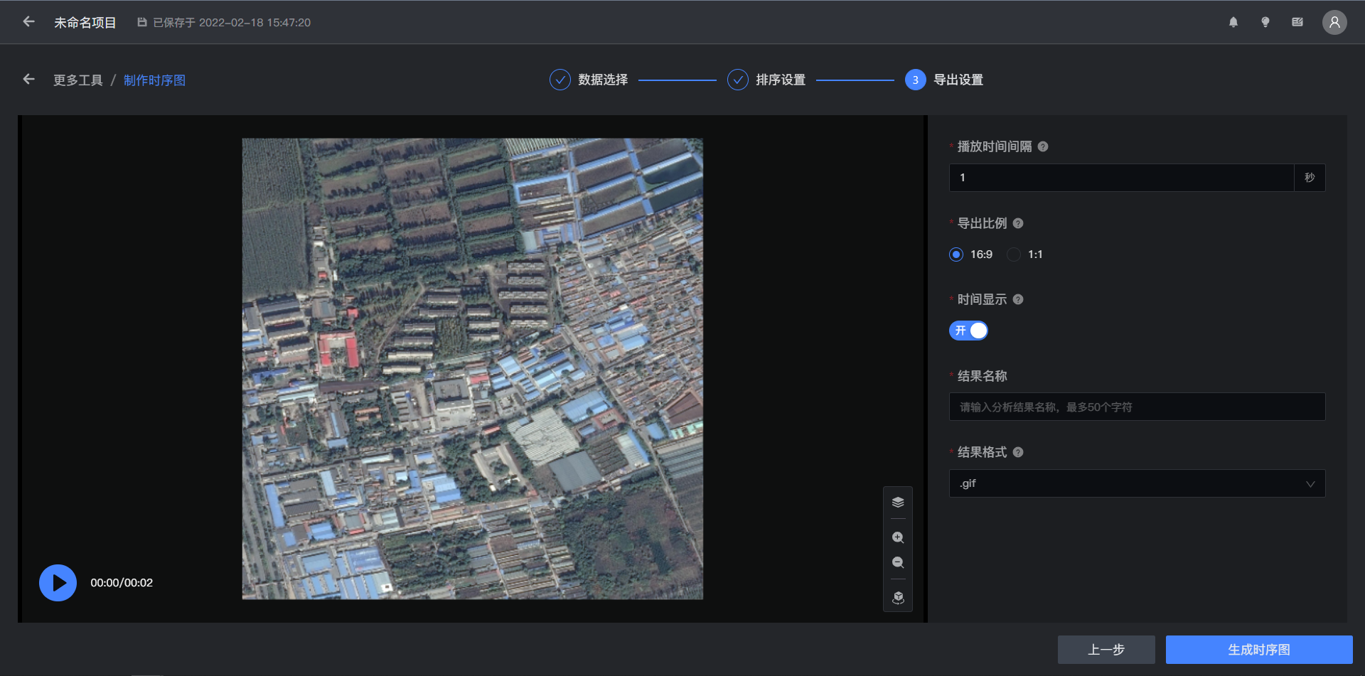 对于多期遥感影像或指数计算后的栅格结果,支持在线进行时序图制作,生成mp4或gif格式的时序动画下载。