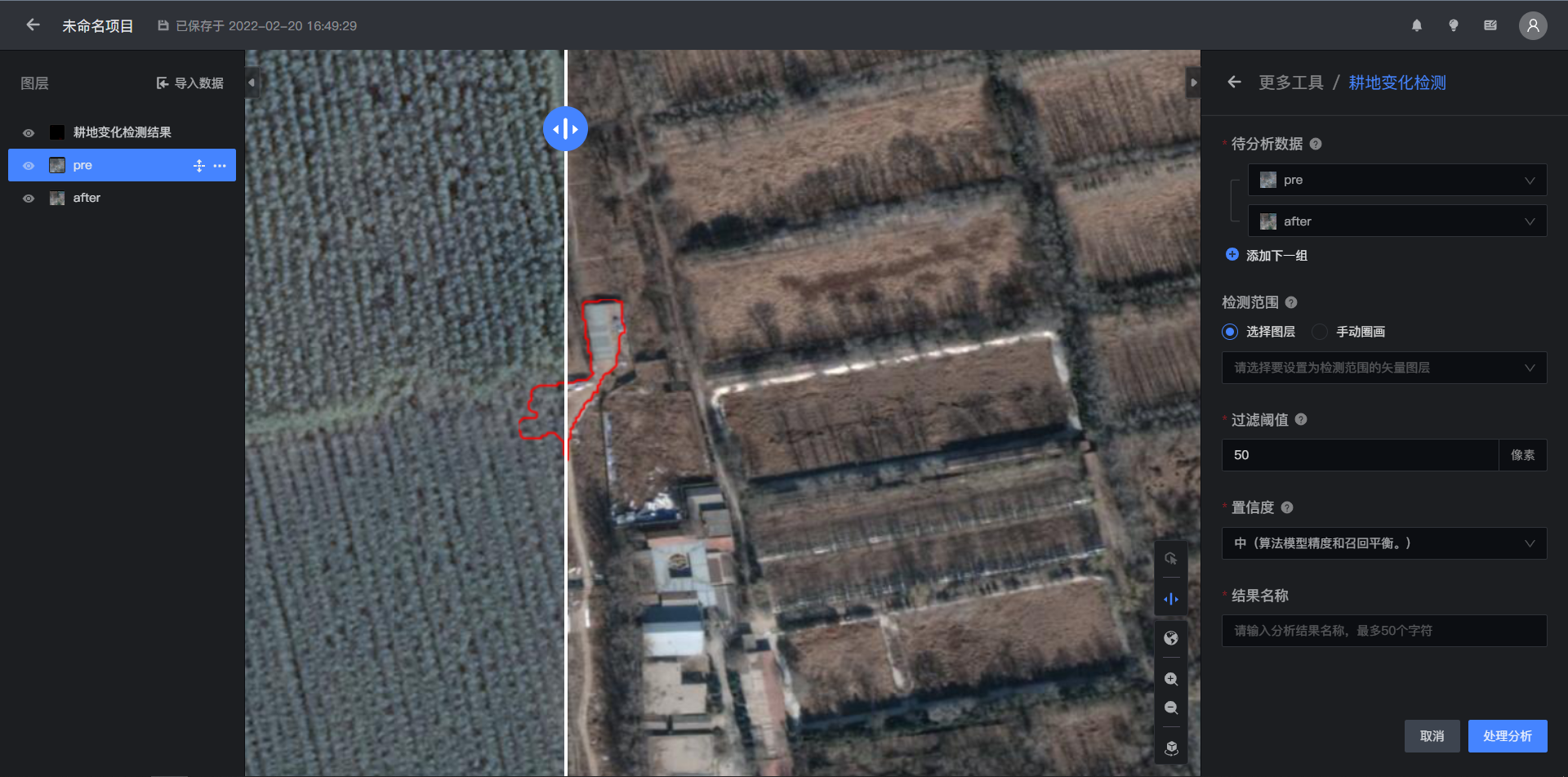 通过比对同一区域不同时期的两张影像,排除季节变化、阴影等干扰因素,提取耕地范围内发生变化的位置和范围,建议使用高分数据,支持0.5m-2m分辨率范围。