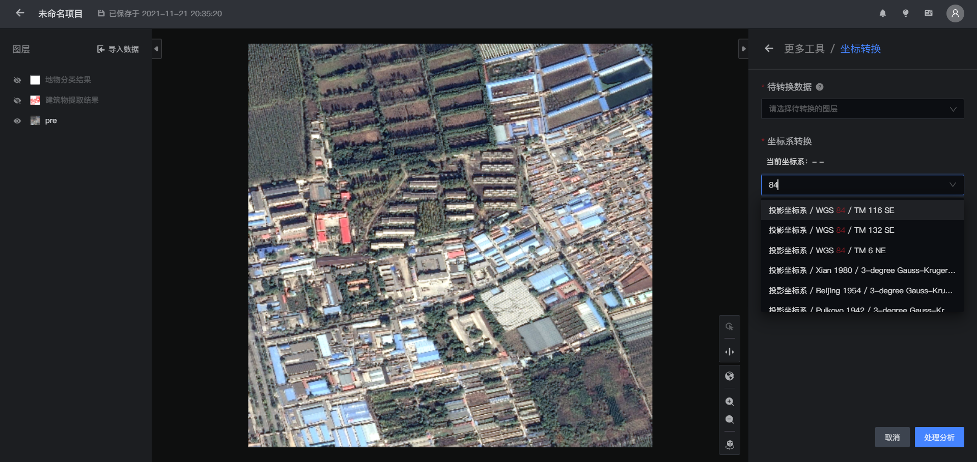 对栅格数据进行投影或地理坐标系转换,转换成果将另存为新的数据图层,同时保存至我的数据列表。