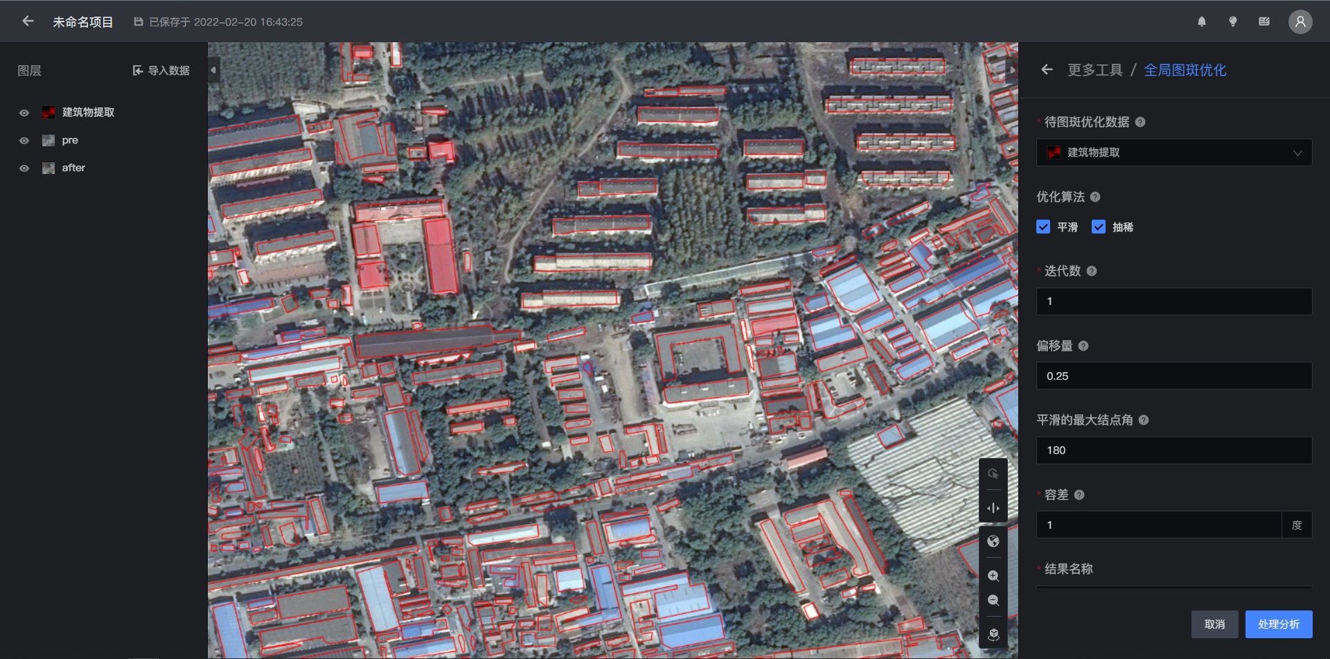 对于AI解译得到的矢量结果,平台支持对图斑进行优化,使用全局图斑优化工具可以批量平滑、稀疏处理所有图斑。
