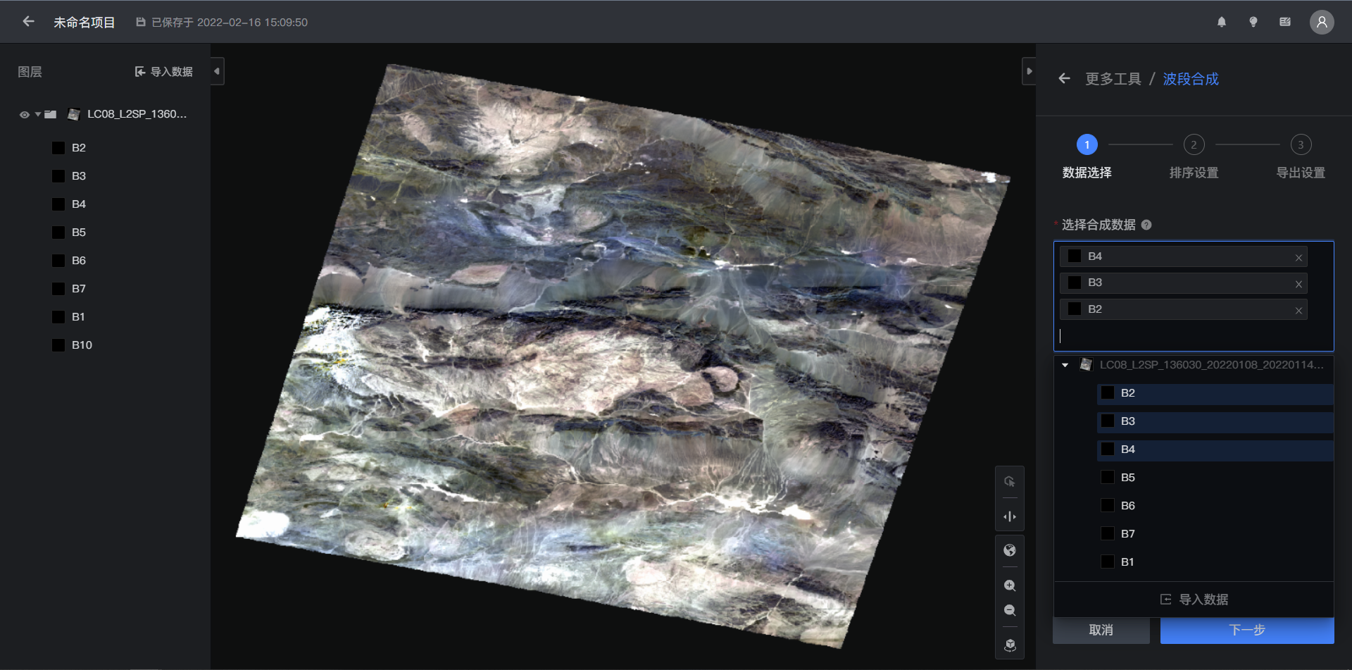 选择收藏公开数据的单波段文件并进行排序确认,进行波段合成处理,得到的多波段合成成果将另存为新的数据图层,同时保存至我的数据列表。