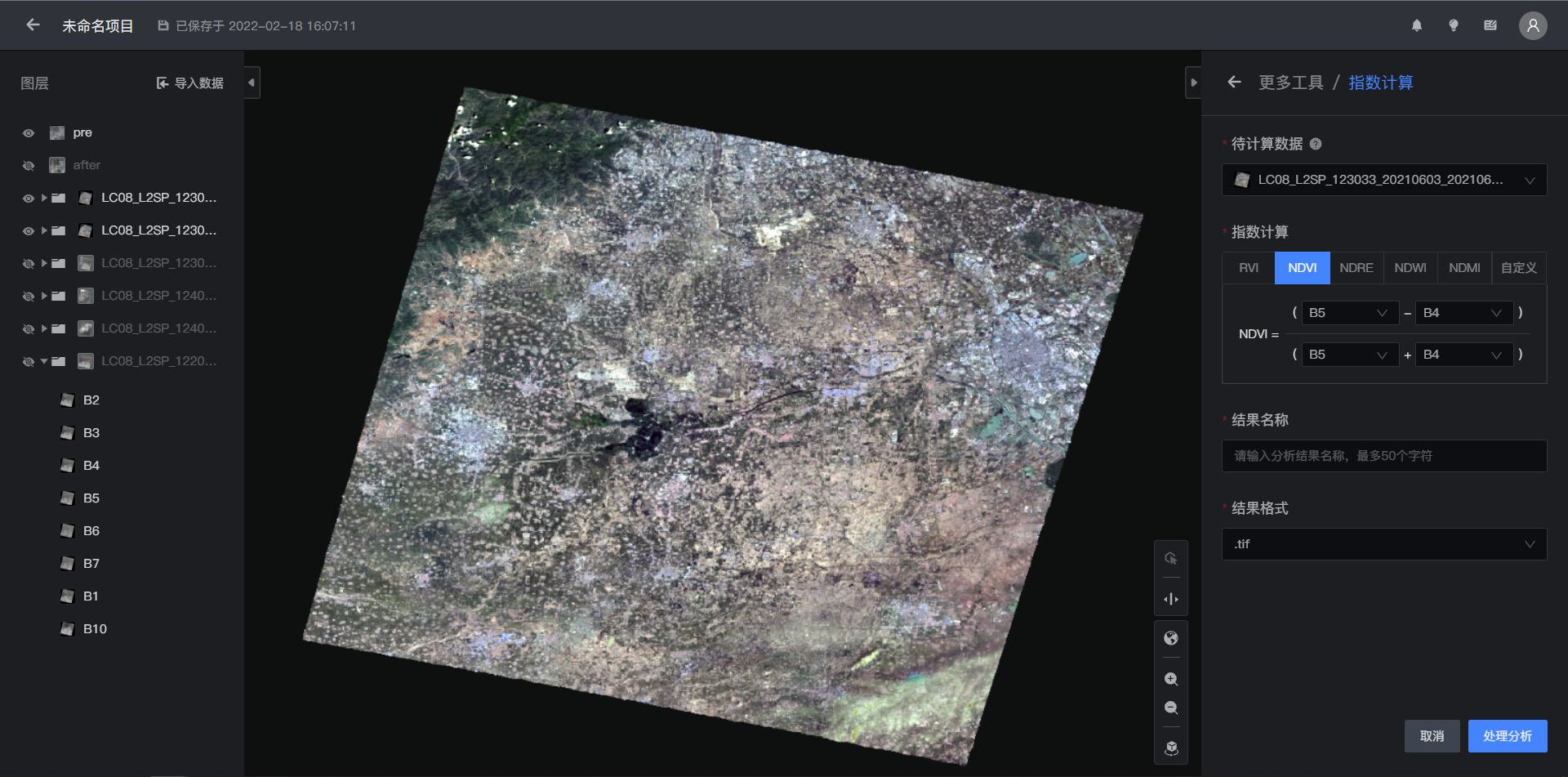 平台目前支持对栅格数据进行坐标转换、影像镶嵌、影像裁剪、指数计算、波段合成、影像重采样等常用操作,更多基础数据处理工具敬请期待。