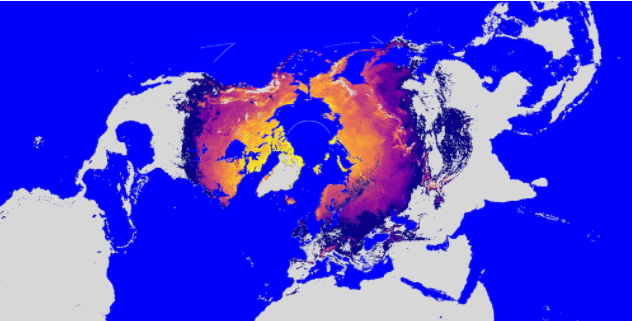 MODIS 每日积雪产品检测到的 2018 年第一天显示了融雪时间的模式,其中每个像素不再包含雪。颜色从紫色(较早)渐变为黄色(较晚),随着每年的第一天每个像素的降雪百分比为零(北极极地立体投影)。