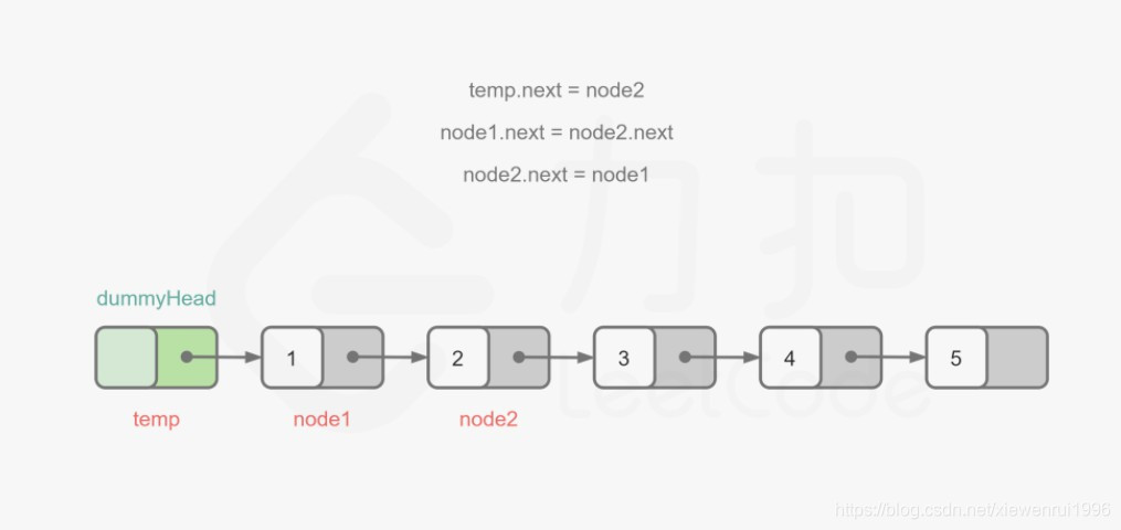 如果 temp 的后面没有节点或者只有一个节点,则没有更多的节点需要交换,因此结束交换。否则,获得 temp 后面的两个节点 node1 和 node2,通过更新节点的指针关系实现两两交换节点。