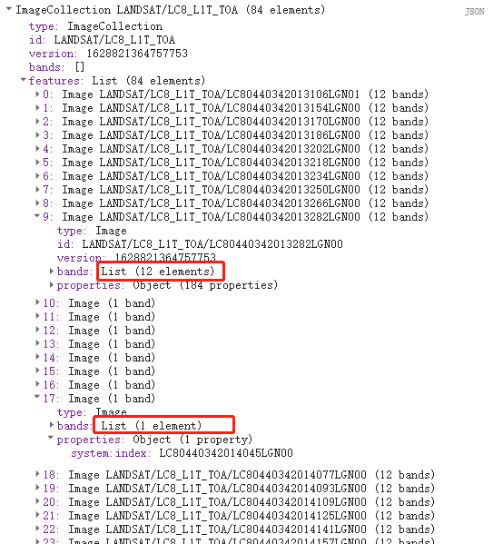 上一次博客中写道同样的影像结果应该是118幅,但是此次经过太阳高度的条件判断,最终就只有84幅了。而且可以从波段的数量上就能看出在返回为0的影像中仅有1各波段,就是一个list附加一个properties里面有一个指针也就是这副影像的系统位置名称