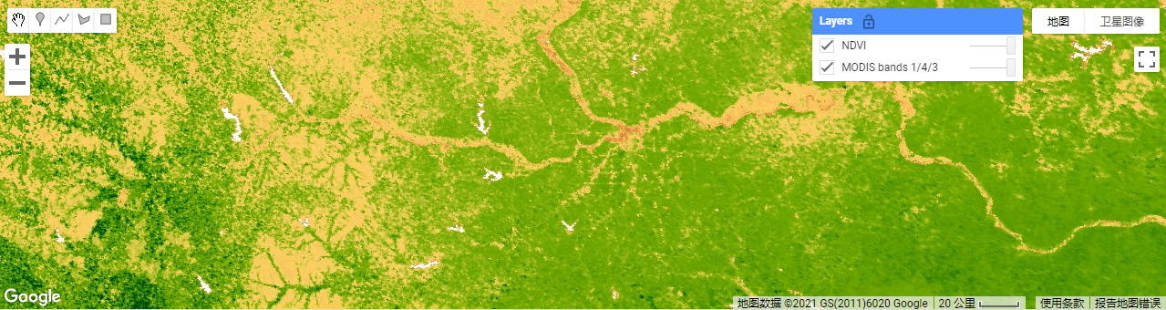 Map.addLayer(ndvi, {min: 0, max: 1, palette: palette}, 'NDVI');