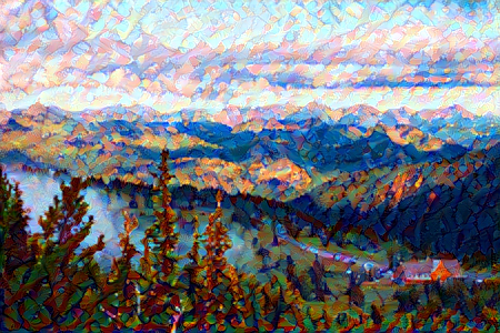 可以看到,由于图像尺寸更大,每一次迭代需要花费更多的时间。从训练得到的图9.15中可以看到,此时的合成图像因为尺寸更大,所以保留了更多的细节。合成图像里面不仅有大块的类似样式图像的油画色彩块,色彩块中甚至出现了细微的纹理。