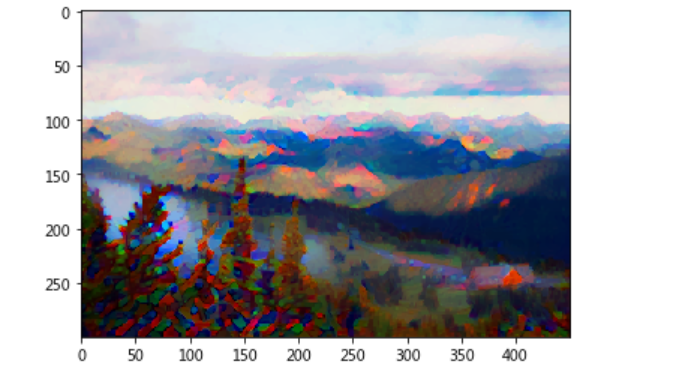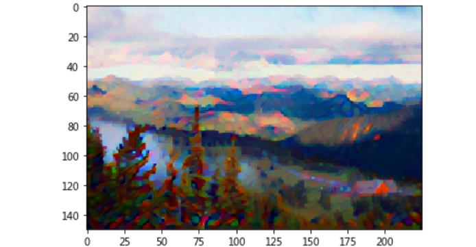 下面我们将训练好的合成图像保存起来。可以看到图9.14中的合成图像保留了内容图像的风景和物体,并同时迁移了样式图像的色彩。因为图像尺寸较小,所以细节上依然比较模糊。