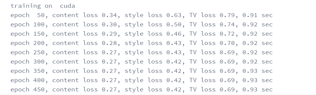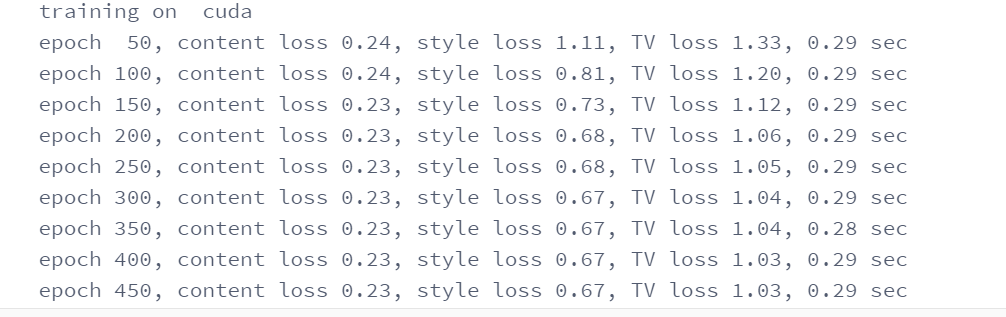 print('epoch %3d, content loss %.2f, style loss %.2f, '