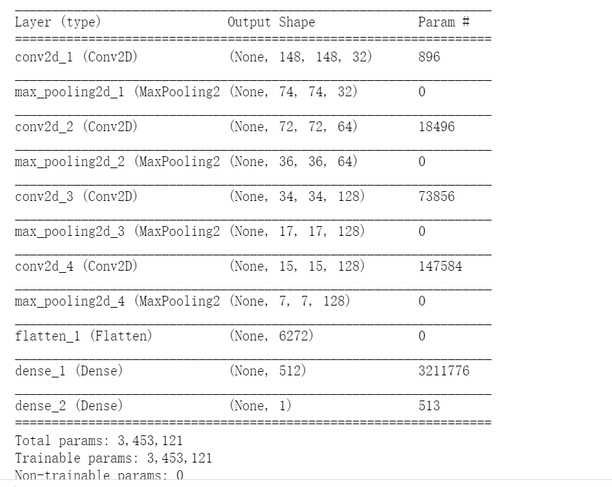 注意 网络中特征图的深度在逐渐增大(从 32 增大到 128),而特征图的尺寸在逐渐减小(从148×148 减小到 7×7)。这几乎是所有卷积神经网络的模式。
