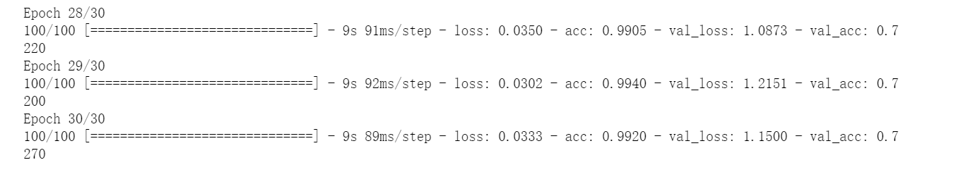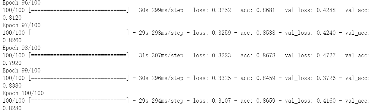 利用生成器,我们让模型对数据进行拟合。我们将使用 fit_generator 方法来拟合,它在数据生成器上的效果和 fit 相同。它的第一个参数应该是一个 Python 生成器,可以不停地生成输入和目标组成的批量,比如 train_generator。因为数据是不断生成的,所以 Keras 模型 要知道每一轮需要从生成器中抽取多少个样本。这是 steps_per_epoch 参数的作用:从生成器中抽取 steps_per_epoch 个批量后(即运行了 steps_per_epoch 次梯度下降),拟合过程将进入下一个轮次。本例中,每个批量包含 20 个样本,所以读取完所有 2000 个样本需要 100 个批量。
