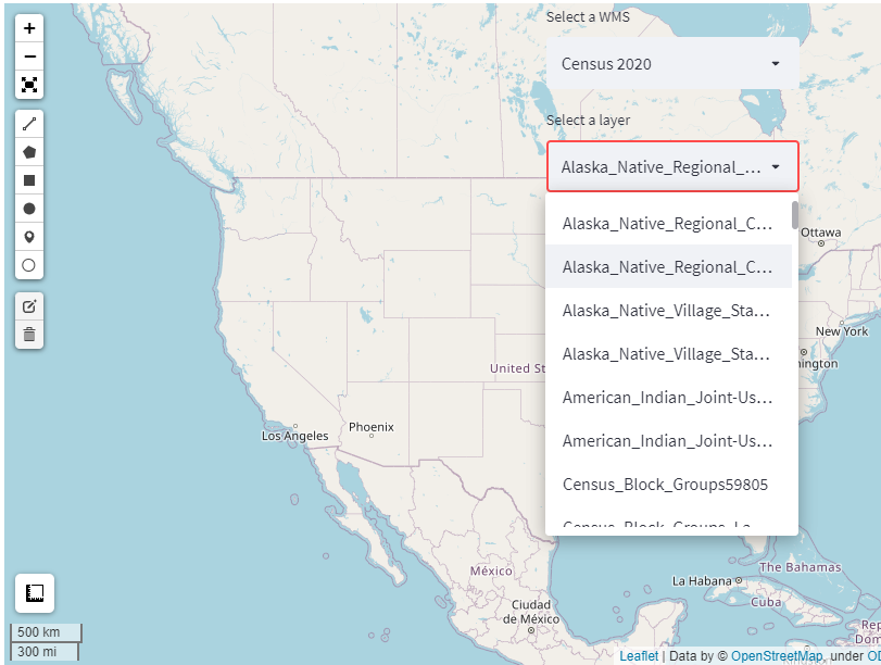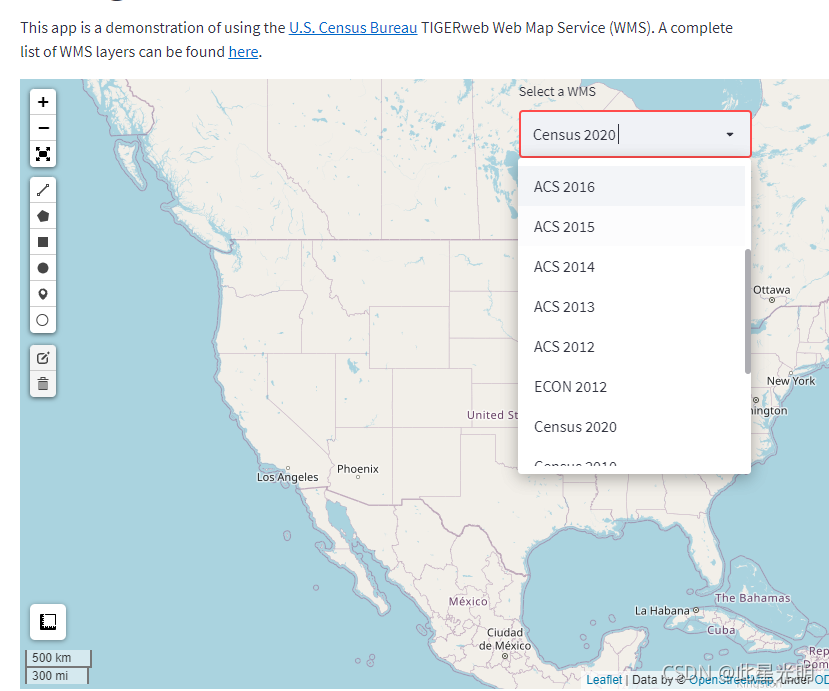 这个应用程序是一个使用美国人口普查局TIGERweb网络地图服务(WMS)的演示。WMS图层的完整列表可以在这里找到。