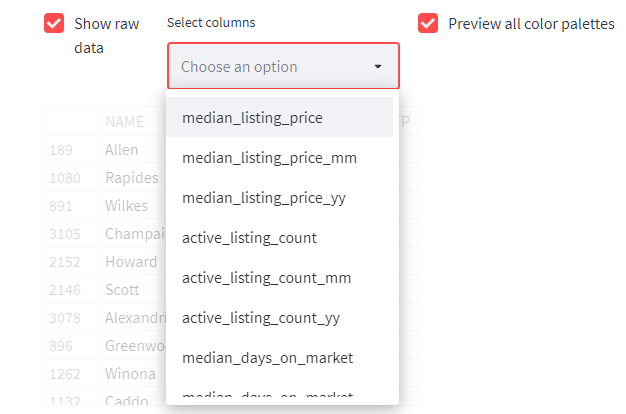 这个交互式仪表盘是为可视化美国房地产数据和多层次的市场趋势而设计的(即,国家、州、县和城市)。数据来源包括Realtor.com的房地产数据和美国人口普查局的地图边界文件。几个开源软件包被用来处理数据和生成可视化,例如,streamlit、geopandas、leafmap和pydeck。