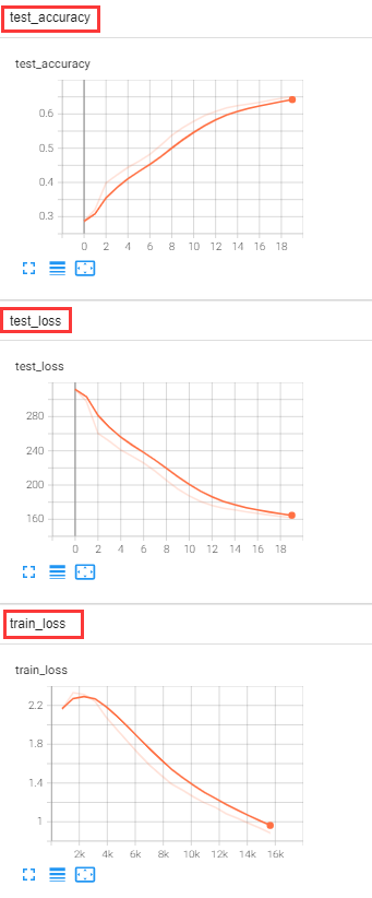 下图是用Tensorboard画的损失和准确率的曲线图,上文的代码中只关注模型的训练步骤,没有设计tensorboard的讲解,在文末源代码中会包含这部分内容。